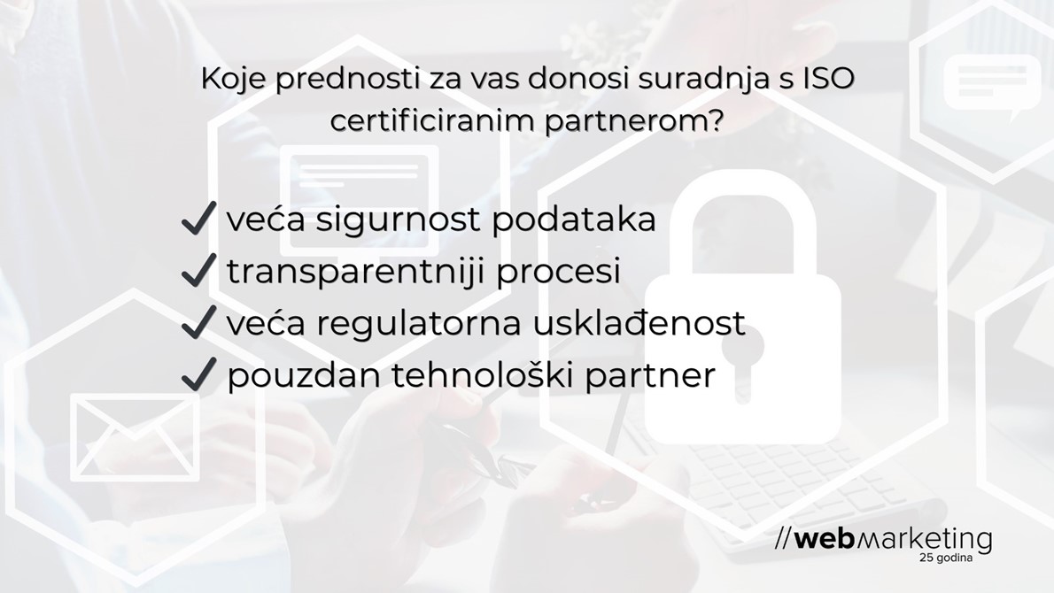 U WEB Marketingu pokrenuli smo proces uvođenja ISO 27001 i ISO 27701 kako bismo sigurnost i privatnost podataka integrirali u sve faze razvoja i upravljanja digitalnim sustavima.
